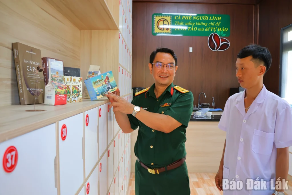 Đại tá Phạm Phú Châu, Bí thư Đảng ủy, Phó Giám đốc Công ty TNHH MTV Cà phê 15 và Thượng tá Lê Trung Thành, Giám đốc công ty (từ trái qua) giới thiệu các sản phẩm “Cà phê người lính”.